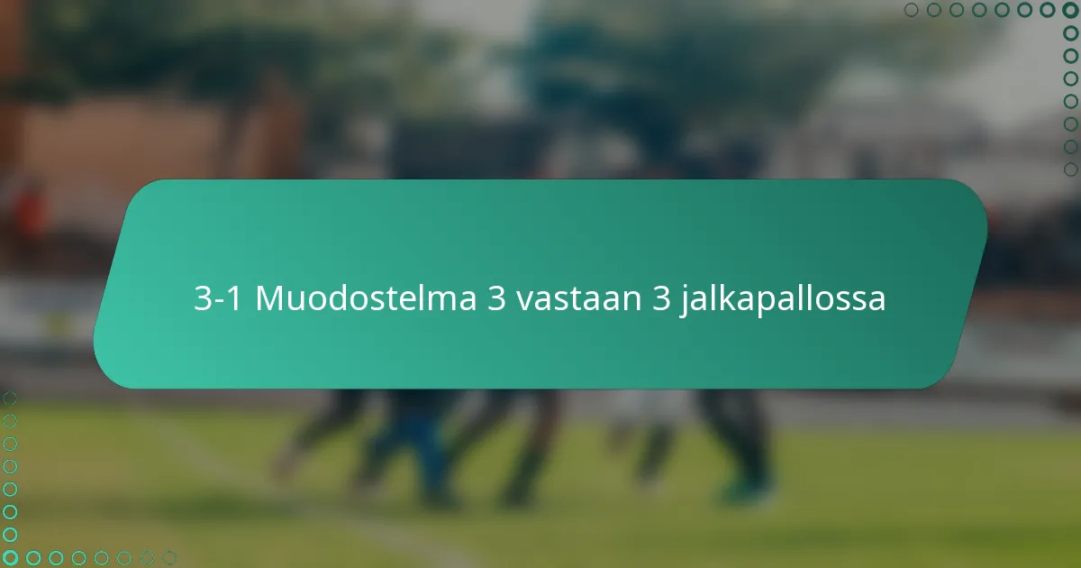 3-1-formaatio kolmen hengen jalkapallossa on strateginen asettelu, jossa kolme pelaajaa keskittyy puolustus- ja keskikenttärooleihin, kun taas yksi pelaaja toimii hyökkääjänä. Tämä muodostelma löytää tasapainon hyökkäys- ja puolustuspelaamisen välillä, mikä mahdollistaa joukkueiden luoda maalintekopaikkoja samalla kun ne pysyvät valppaina vastahyökkäyksille. Sen suunnittelu edistää vahvaa keskikenttäpresenssiä, vaikka sillä voi olla rajoituksia verrattuna muihin muodostelmiin, kuten 2-1 ja 1-2.